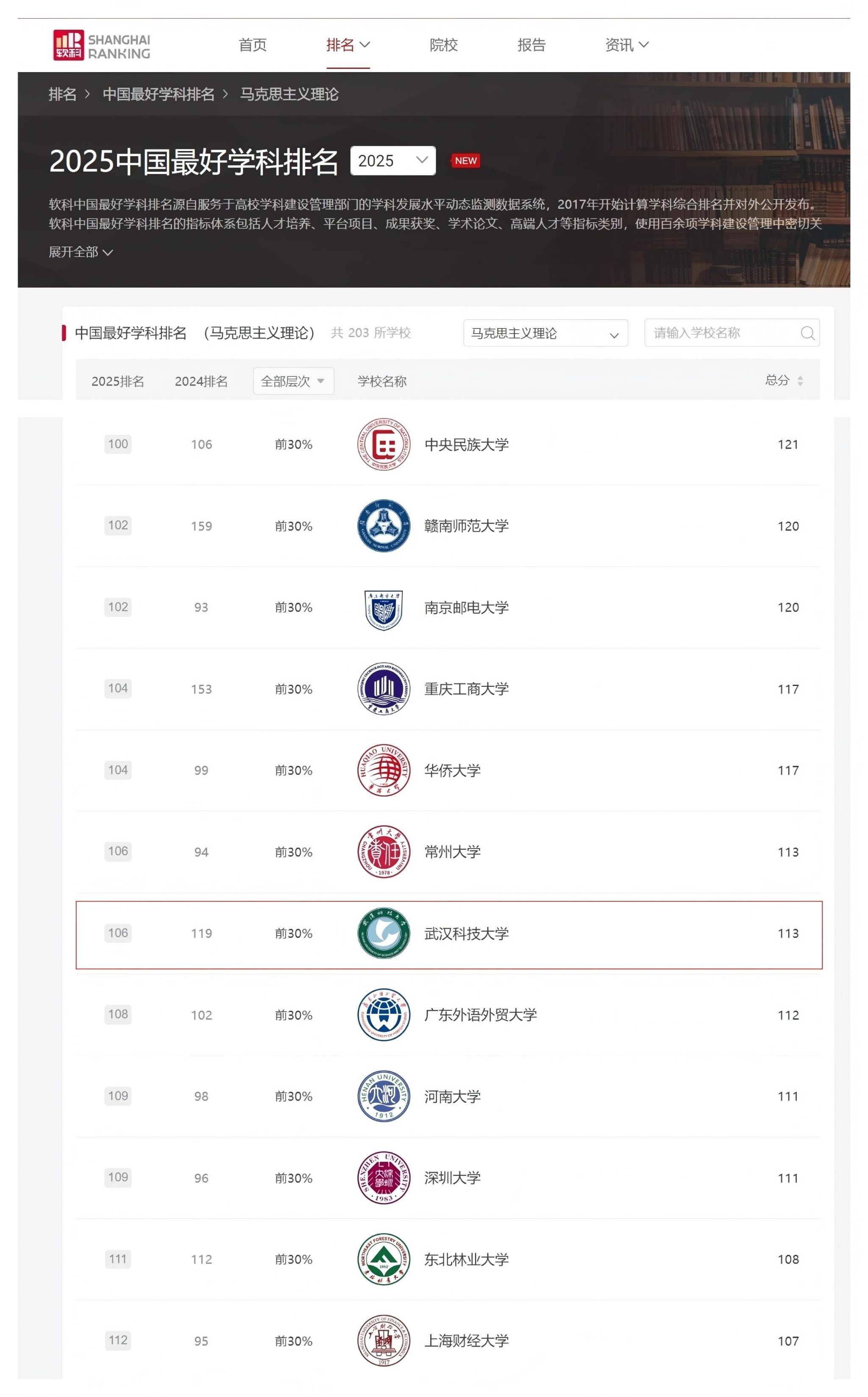 本网讯(通讯员 杨洋)2025年10月15日,高等教育评价专业机构软科正式发布“2025软科中国最好学科排名”,我们马克思主义理论学科评级为B(全国前30%),在全国高校中排名第106,比2023年上升66名(2023年排名为172名),比2024年上升了13名(2024年排名为119名),创我们学科建设历史最好成绩,也是我们学科建设方面取得的又一重大突破。