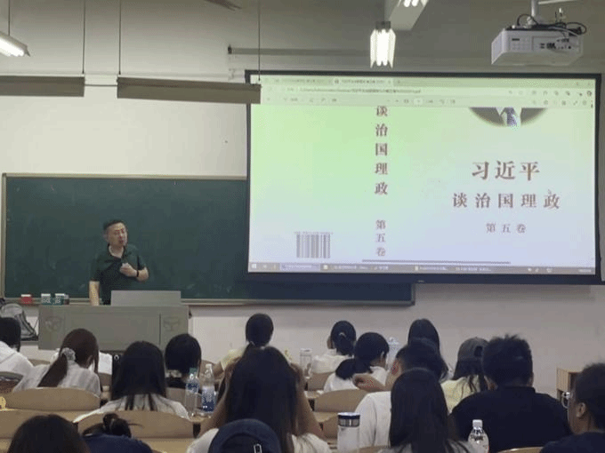 今年7月出版的《习近平谈治国理政》(第五卷)是全面系统反映习近平新时代中国特色社会主义思想最新成果的权威著作。高校思政课将党的创新理论最新成果融入课堂,用科学理论武装青年学生头脑意义重大。而面对不熟悉党史的青年学生,如何进一步将党史故事和经典理论讲活,是广大思政课教师持续探索的课题。9月19日下午,我们教授张齐武在“概论”课堂上讲授第四章“社会主义建设道路初步探索的理论成果”时,并没有停留在对史实的简单介绍,而是将《习近平谈治国理政》第五卷第五章“一体推进教育科技人才事业发展”中的重要论述引入课堂,启发同学们对马克思主义中国化时代化的思考。张齐武特别向同学们指出,“在上世纪五十年代,党就提出了“向科学进军”的口号,后又强调“四个现代化”关键在科学技术现代化,其思想精髓和真理认识一直延续发展至今”。他认为:“将总书记的最新重要论述与‘概论’课程的理论阐述相结合,搭建一座连接历史与当下的桥梁,将我们学生特别关心的生产力发展、科技创新等议题与经典理论结合起来,有助于让思政课真正走进学生心里,形成‘见人见事见精神’的课堂实践”。