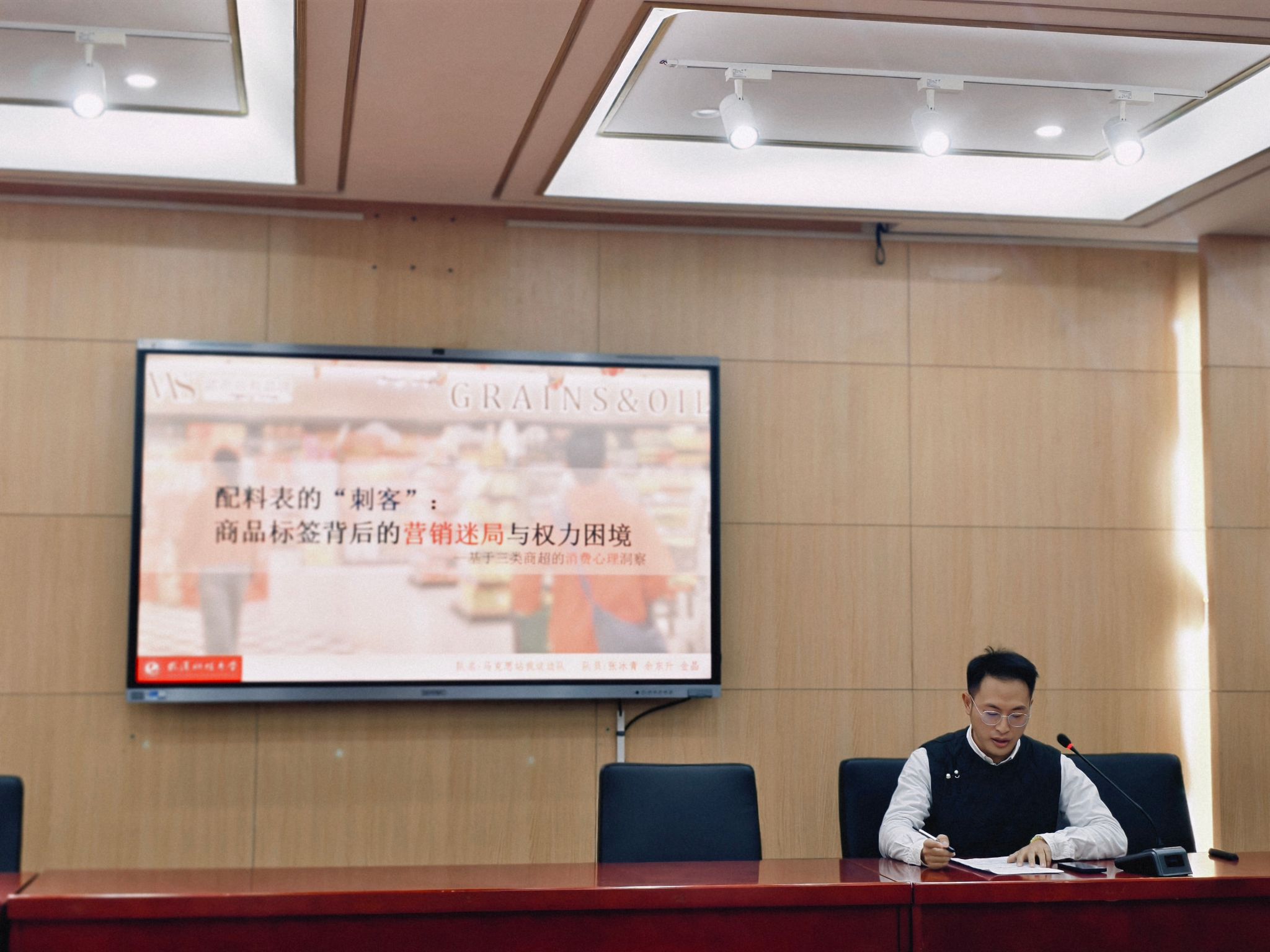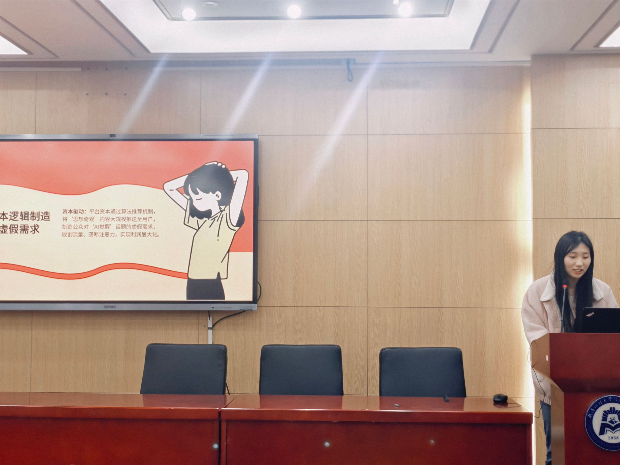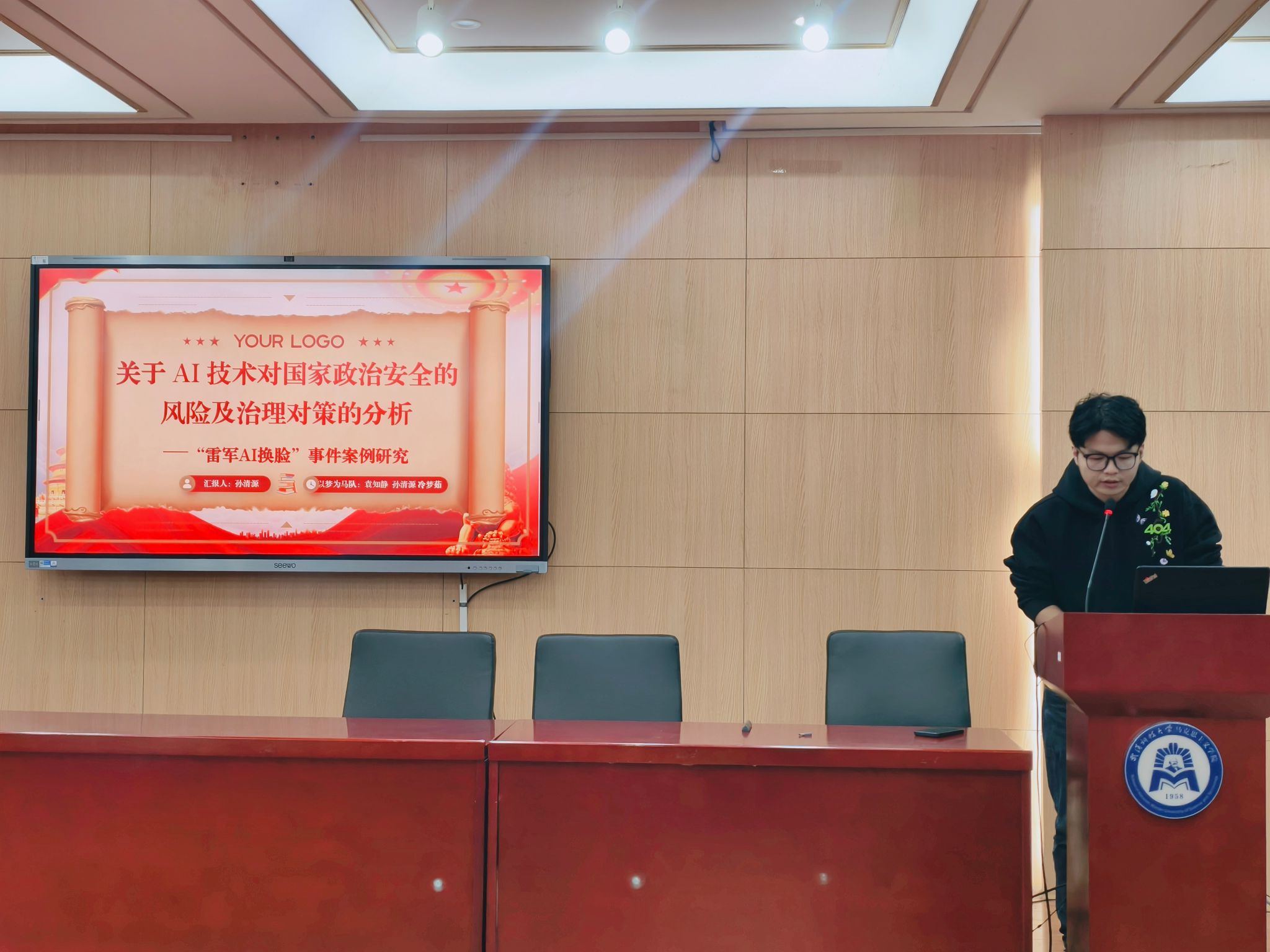 初赛现场分为案例展示、观点陈述与评委提问三个环节。比赛中,各参赛队伍以PPT展示为载体,逻辑清晰地阐述案例背景、分析视角及核心观点。参赛队伍围绕“虚实交织领域的意识形态新挑战:关于采访AI自我认知Sora视频现象”“罗官章精神:时代解读与乡村产业振兴路径探析”“关于AI技术对国家政治安全的风险及治理对策的分析—基于雷军AI换脸事件的案例研究”“配料表的刺客:商品标签背后营销迷局与权力困境”等多个时事热点领域,选取典型案例进行深度剖析。作品中既有对国家政策的精准解读,也有对社会现象的理性审视,更有结合专业知识提出的创新性解决方案,充分体现了我们学子的广阔视野与扎实学识。